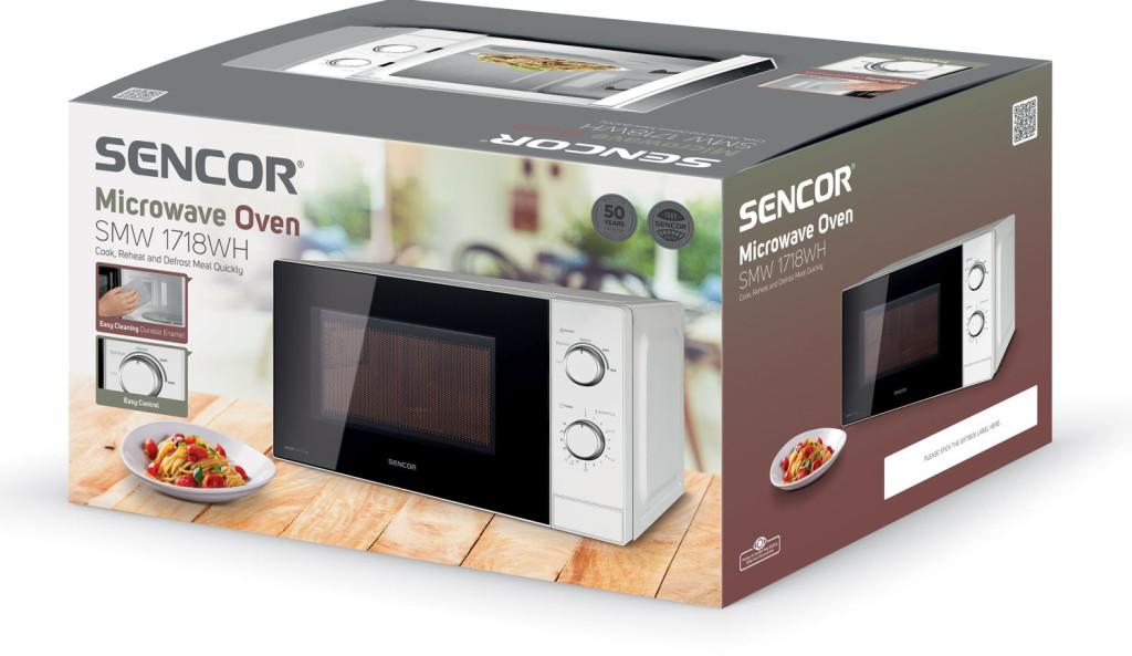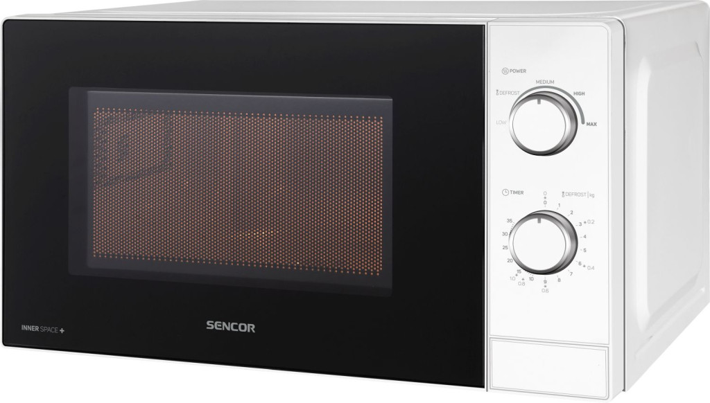 SENCOR SMW 1718WH MIKROHULLÁMÚ SÜTŐ Manuális vezérlésű mikrohullámú sütő 5 teljesítményszint a különböző főzésekhez és melegítésekhez Gyors és higiénikus élelmiszer felolvasztás A Sencor SMW 1718WH egy letisztult, mégis elegáns megjelenésű fehér szabadon álló mikrohullámú sütő. Az akár 700 W teljesítményre képes készülék manuális vezérlésű. A 20 literes kapacitás mellett öt különböző fokozattal lett felszerelve, továbbá elérhető a kiolvasztási funkció, valamint beépítésre került egy maximum 35 perces időzítő. A 255 mm átmérővel rendelkező forgó tányér ideális a háztartásokban leggyakrabban előforduló edényekhez, tálakhoz.5 KÜLÖNBÖZŐ TELJESÍTMÉNY SZINT Az egész folyamat egyszerű, praktikus és mindenekelőtt gyors! Az öt üzemmód az egyes ételek és élelmiszerek mikrohullámú teljesítményének csökkentésére vagy növelésére szolgál. Kiválóan alkalmas melegítésre, főzésre, de ételek kiolvasztására is. Csak forgassa el a szabályozót, állítsa be a kívánt üzemmódot és időt 35 percen belül. · MIN – Minimális teljesítmény 17 % · DEFROST – Kiolvasztás 33 % · LOW – Alacsony teljesítmény 55 % · MEDIUM – Közepes teljesítmény 77 % · MAX – Maximális teljesítmény 100 %AJTÓNYITÁS EGYSZERŰEN A kezelőpanelbe integrált ajtónyitó gomb megnyomásával egyszerűen kinyitható a Sencor mikrohullámú sütő ajtaja. Az oldalra nyíló ajtó kialakításnak köszönhetően hatékonyabban tudja használni szinte minden helyzetben. A szabadonálló kialakításnak köszönhetően a készülék elhelyezése szinte határtalan.EGYSZERŰ KARBANTARTÁS A mikrohullámú sütő kialakításának köszönhetően egyszerűen tisztítható. A fém kivitelű ház és a zománcozott belső felület nedves ruhával tisztítható. A forgó tányért lehetősége van akár mosogatógépen akár folyó víz alatt elmosni.ALACSONY ZAJSZINT A Sencor mikrohullámú sütője még maximális teljesítmény melletti működés esetén is mindössze 63 dB (A) zajszinttel rendelkezik. Szinte észre se fogja venni, hogy működő a készüléket csak a beállított programok végét jelző hang figyelmezteti, hogy elkészült az étel!BIZTONSÁG MINDENEKELŐTT A beépített biztonsági mechanizmus és a csúszásmentes lábak garantálják a készülék biztonságos használatát. Teljes ellenőrzést tesz lehetővé a főzési, melegítési folyamat alatt. Tökéletes láthatóságot biztosít a belső tér megvilágításával.MŰSZAKI PARAMÉTEREK Telepítési lehetőségek: SZABADON ÁLLÓ Mikrohullámú sütő típus: ALAPVETŐ Kapacitás: 20 l Mikrohullámú sütő teljesítmény (W): 700 W Grill: Nem Tányér átmérő: 25,5 cm Ajtónyitás: BAL Magasság: 25,9 cm Szélesség: 44 cm Mélység: 36,4 cm Szín: Fehér Tömeg: 10 kg