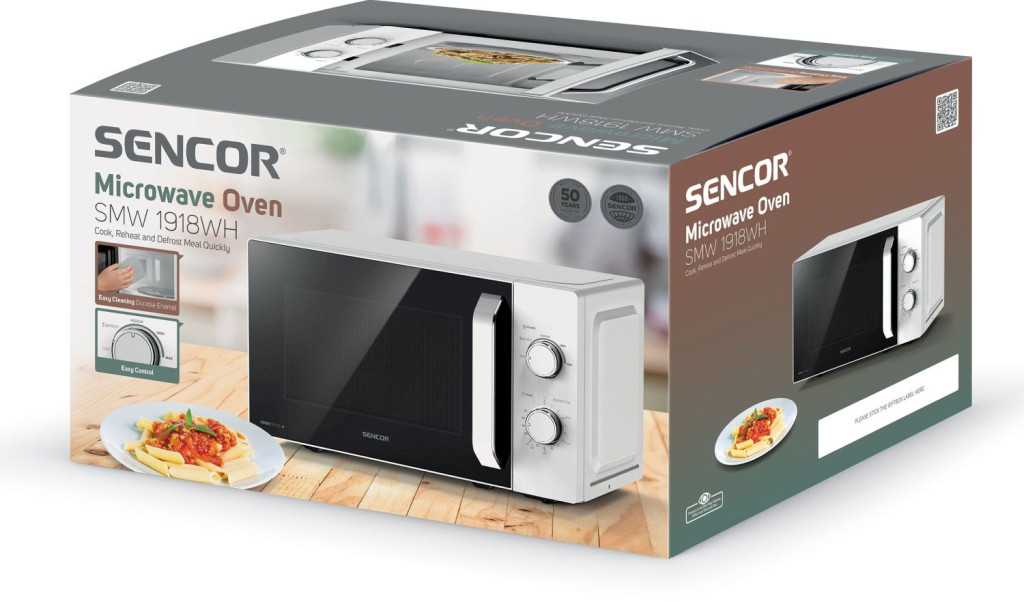 SENCOR SMW 1918WH MIKROHULLÁMÚ SÜTŐ 20 literes maximális kapacitás 5 teljesítményszint a különböző főzésekhez és melegítésekhez Gyors és higiénikus élelmiszer felolvasztás A Sencor SMW 1918WH egy letisztult, mégis elegáns megjelenésű fehér szabadon álló mikrohullámú sütő. Az akár 700 W teljesítményre képes készülék manuális vezérlésű. A 20 literes kapacitás mellett öt különböző fokozattal lett felszerelve, továbbá elérhető a kiolvasztási funkció, valamint beépítésre került egy maximum 35 perces időzítő. A 255 mm átmérővel rendelkező forgó tányér ideális a háztartásokban leggyakrabban előforduló edényekhez, tálakhoz.5 KÜLÖNBÖZŐ TELJESÍTMÉNY SZINT Az egész folyamat egyszerű, praktikus és mindenekelőtt gyors! Az öt üzemmód az egyes ételek és élelmiszerek mikrohullámú teljesítményének csökkentésére vagy növelésére szolgál. Kiválóan alkalmas melegítésre, főzésre, de ételek kiolvasztására is. Csak forgassa el a szabályozót, állítsa be a kívánt üzemmódot és időt 35 percen belül. · MIN – Minimális teljesítmény 17 % · DEFROST – Kiolvasztás 33 % · LOW – Alacsony teljesítmény 55 % · MEDIUM – Közepes teljesítmény 77 % · MAX – Maximális teljesítmény 100 %EDÉNYEK ÉS TÁLAK A mikrohullámú sütőbe olyan edények használata az ideális, amelyek átlátszóak és semmi sem akadályozza a mikrohullámok szabad terjedését. Fém edényeket vagy fém díszítésű tányérokat a sütőbe ne tegyen be mert a fém nem engedik át a mikrohullámokat. Lehetőség szerint kerek vagy ovális edényeket használjon. A mikrohullámú sütőben használható edényekről részletes tájékoztatást olvashat a készülék használati útmutatójában. Kérjük figyelmesen olvassa el!EGYSZERŰ KARBANTARTÁS A mikrohullámú sütő kialakításának köszönhetően egyszerűen tisztítható. A fém kivitelű ház és a zománcozott belső felület nedves ruhával tisztítható. A forgó tányért lehetősége van akár mosogatógépen akár folyó víz alatt elmosni.AJTÓNYITÁS EGYSZERŰEN Az ajtóra rögzített nyitó kar segítségével, egyszerűen kinyitható a Sencor mikrohullámú sütő ajtaja. Az oldalra nyíló ajtó kialakításnak köszönhetően hatékonyabban tudja használni szinte minden helyzetben. A szabadonálló kialakításnak köszönhetően a készülék elhelyezése szinte határtalan.ALACSONY ZAJSZINT A Sencor mikrohullámú sütője még maximális teljesítmény melletti működés esetén is mindössze 63 dB (A) zajszinttel rendelkezik. Szinte észre se fogja venni, hogy működő a készüléket csak a beállított programok végét jelző hang figyelmezteti, hogy elkészült az étel!BIZTONSÁG MINDENEKELŐTT A beépített biztonsági mechanizmus és a csúszásmentes lábak garantálják a készülék biztonságos használatát. Teljes ellenőrzést tesz lehetővé a főzési, melegítési folyamat alatt. Tökéletes láthatóságot biztosít a belső tér megvilágításával.MŰSZAKI PARAMÉTEREK Telepítési lehetőségek: SZABADON ÁLLÓ Mikrohullámú sütő típus: ALAPVETŐ Kapacitás: 20 l Mikrohullámú sütő teljesítmény (W): 700 W Grill: Nem Tányér átmérő: 25,5 cm Ajtónyitás: BAL Magasság: 25,9 cm Szélesség: 44 cm Mélység: 36,4 cm Szín: Fehér Tömeg: 10 kg